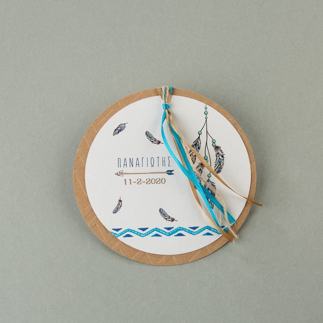 Στρογγυλό προσκλητήριο με θέμα τη μπλε ονειροπαγίδα. Το προσκλητήριο δένεται στο επάνω μέρος του με γαλάζια κορδέλα και σπάγκο πάνω σε στρογγυλή κάρτα χρώματος craft. Το προσκλητήριο μπορεί να συνδυαστεί με μπομπονιέρα κουτί στο ίδιο θέμα. Το προσκλητήριο μπορεί να συνοδεύεται από craft φάκελο .Σε περίπτωση που επιθυμείτε φάκελο για την πρόσκληση, επικοινωνήστε μαζί μας.