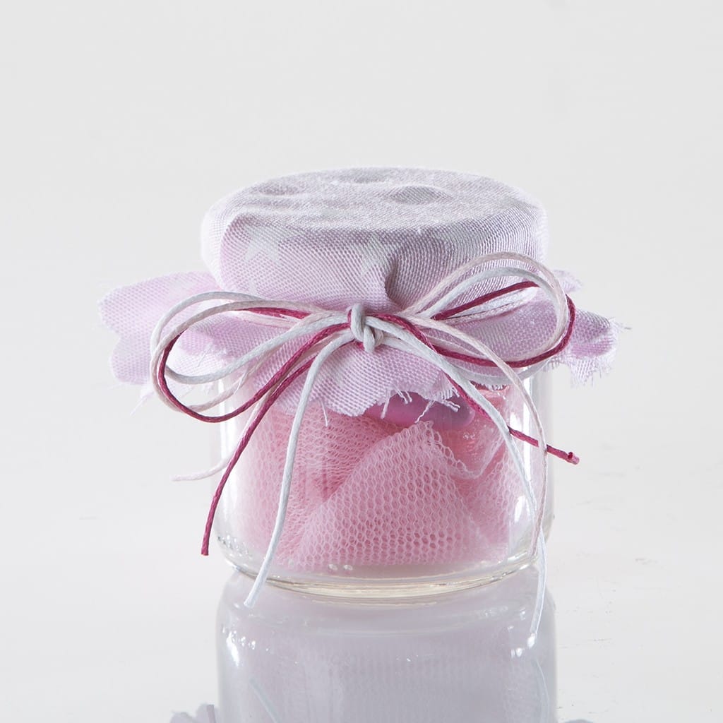 Γυάλινο βαζάκι με αστεράκια σε ροζ ή γαλάζιο ύφασμα για μία ονειρική βάπτιση. Η μπομπονιέρα περιλαμβάνει 5 σοκολατένια κουφέτα «Χατζηγιαννάκη» piccolino, τυλιγμένα σε τούλι και δένεται με σχοινάκια σε συνδυασμό χρωμάτων.